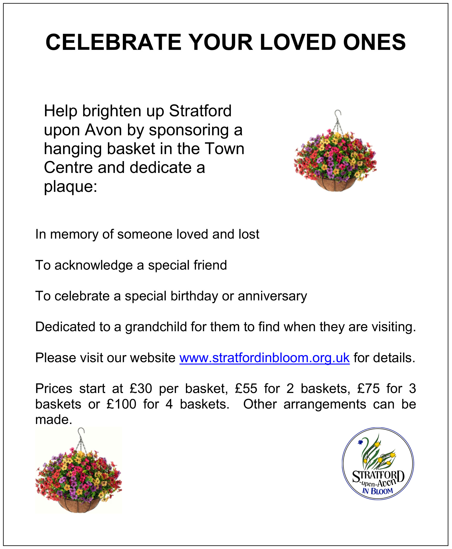 Help brighten up Stratford upon Avon by sponsoring a hanging basket in the town centre and dedicate a plaque.