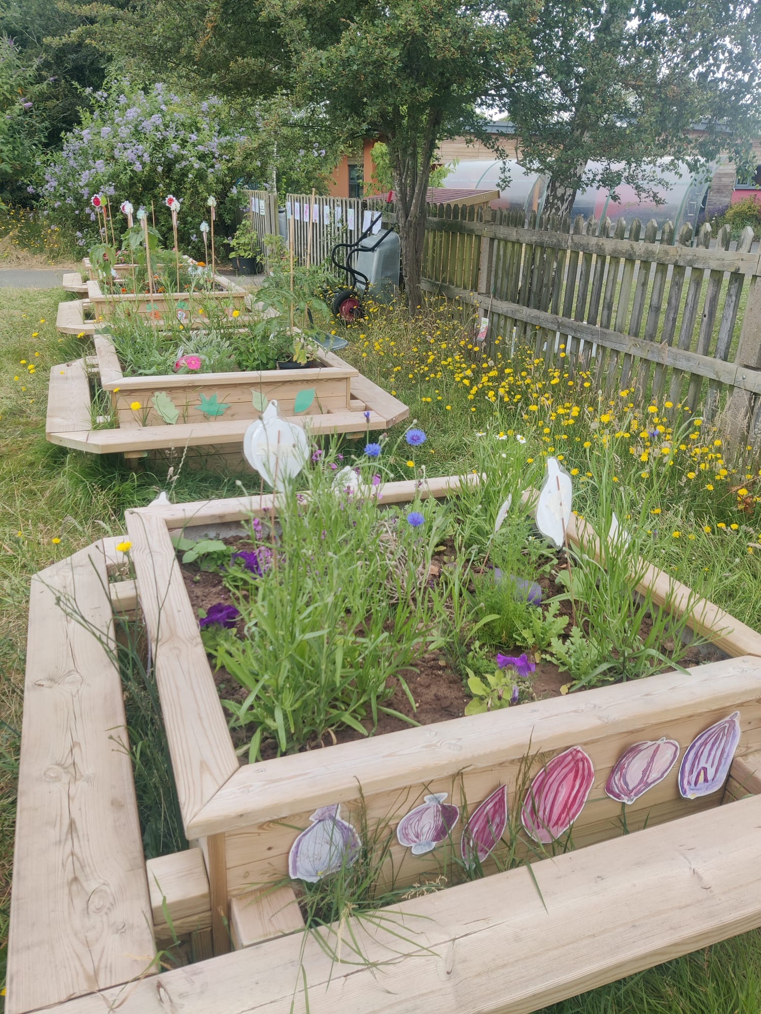 Other attractions are spread across a fairly small area and include a mini beast hotel, planted tyres, a digging area near the mud kitchen and planted sink. A peace pole stands tall in the middle of a planter. Planted pots with vegetables include strawberries, tomatoes and runner beans. A splendid apple tree is providing a home to apple ermine moths who will probably leave the tree this year and find a new home but you can still feast on the apples.