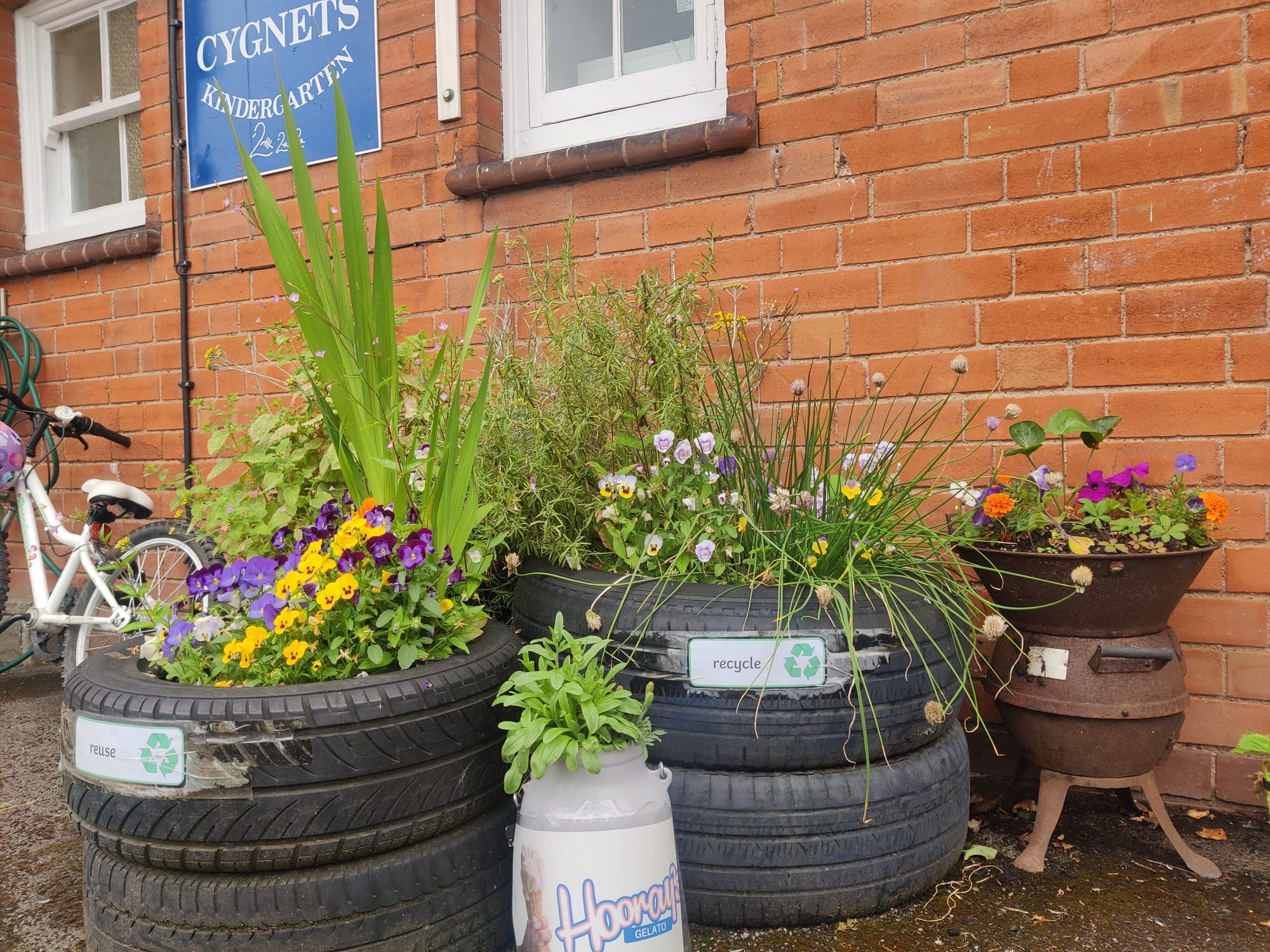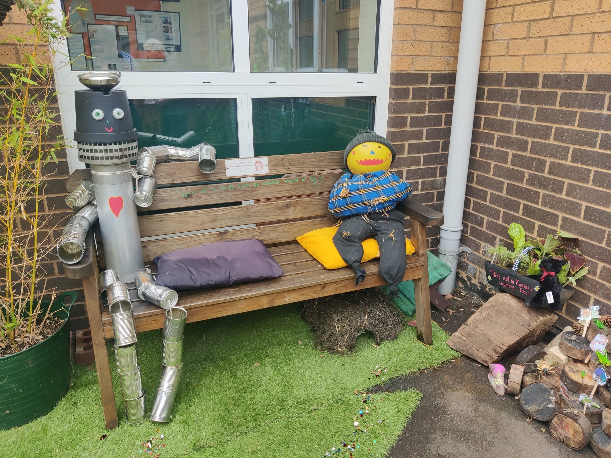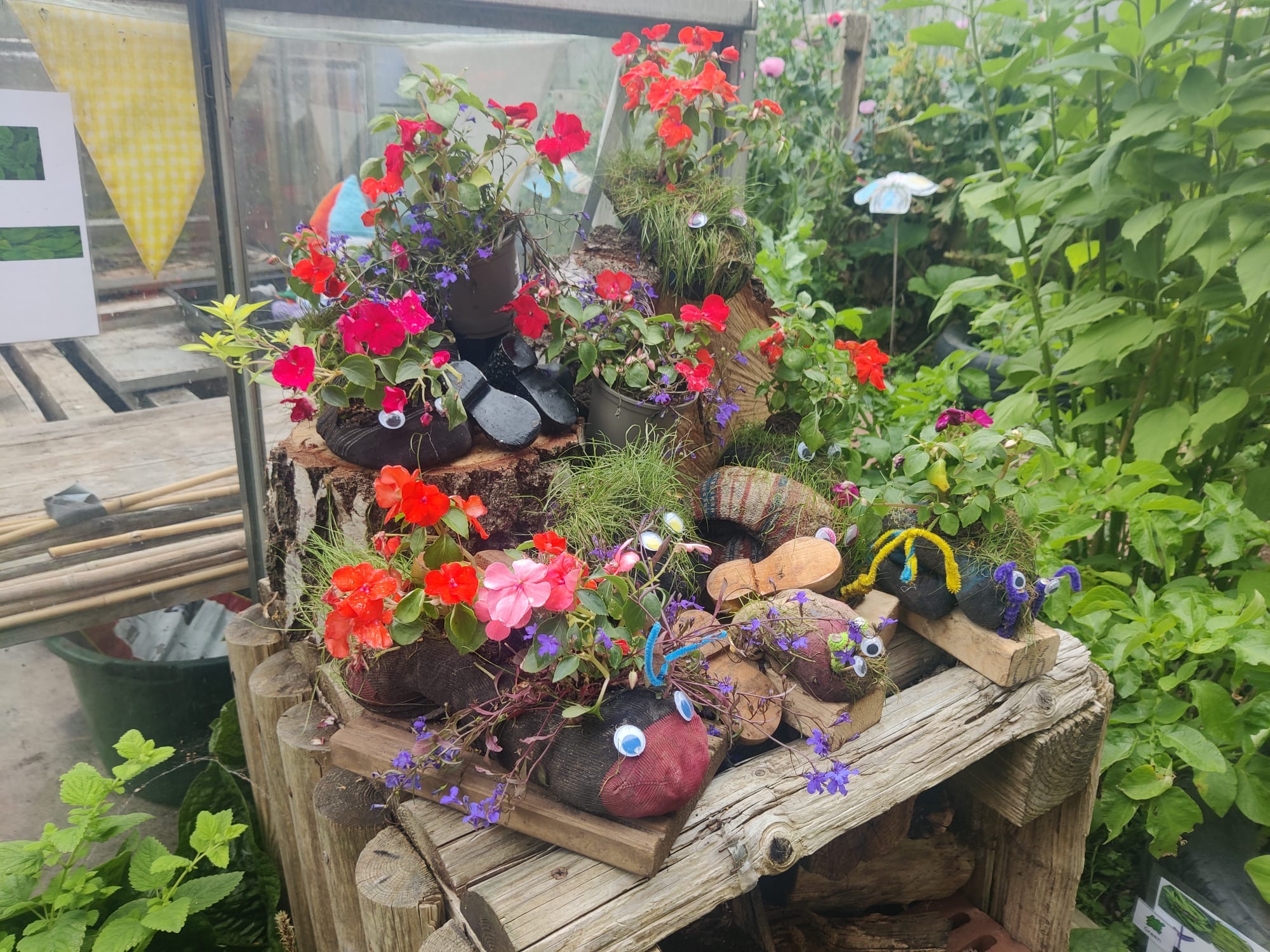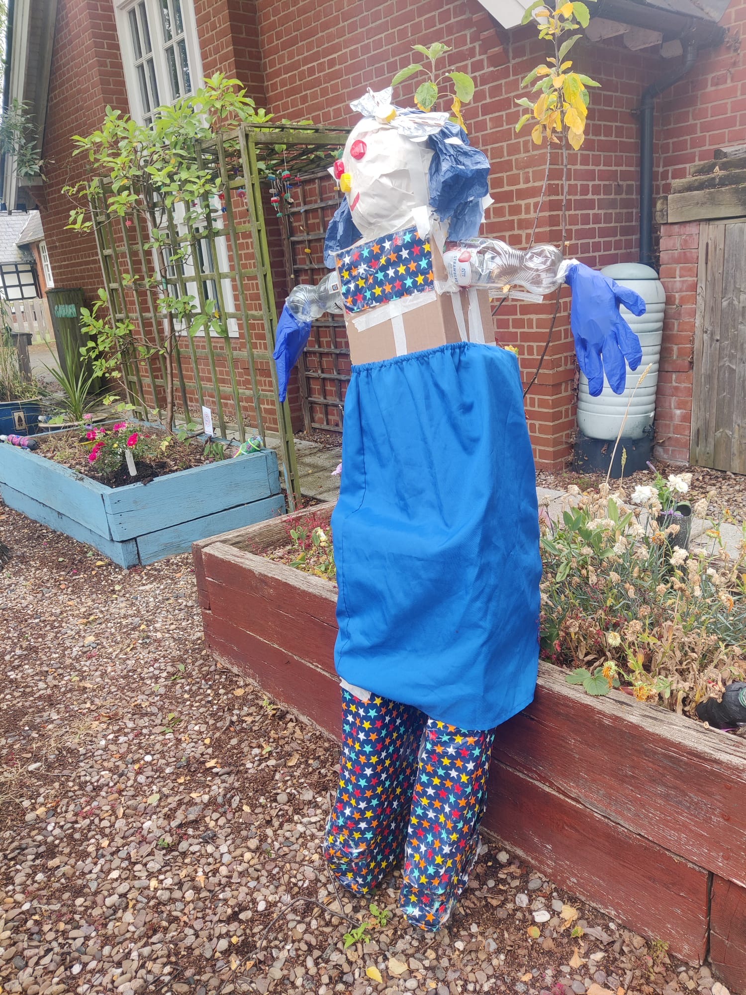 A wormery and bug hotel were nestled along the side of the building with more planters containing seed bombs made by the year 4 students, containing wild flower seeds, hoping for sufficient rain to enable them to explode. The seed bombs were carefully watched over by Skelly, a scarecrow made from recycled and upcycled materials.