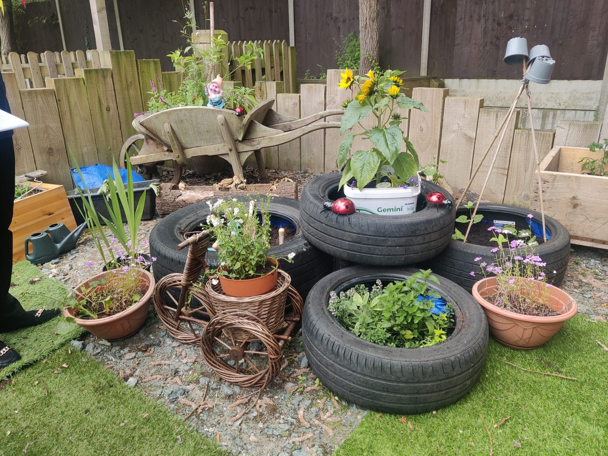 Woven around the theme of the Wizard of Oz – skilful use of the characters of the scarecrow, lion and tinman all made from recycled / upcycled materials. This helped to create a sanctuary space combining planting and crafts to make a peaceful environment. Incorporating tyre planters, a herb garden in a sink, as well as strawberries and peppers. The children had painted yellow pebbles to brighten up the area (as part of the yellow brick road) with wildflower seeds. The overall impression is of a colourful area with geraniums, lobelia and herb robert.
